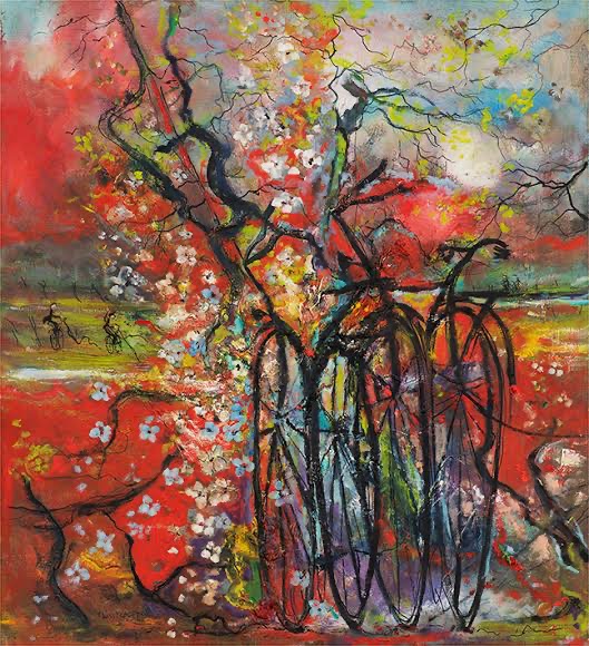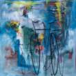 Han skapar ljusa luftiga verk, där cykeln ofta är berättaren av tillbakablickarna.